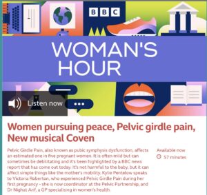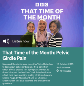 On 14th October, BBC Radio 5 Live featured our co-ordinator Victoria Roberton on Naga Munchetty’s programme “That Time of the Month”, discussing her personal experience of PGP and the vital work of the Pelvic Partnership with Dr Nighat Arif and Dr Christine Ekechi. The programme explored how this condition, which affects up to one in five pregnant women, is often dismissed or inadequately treated within the NHS.
